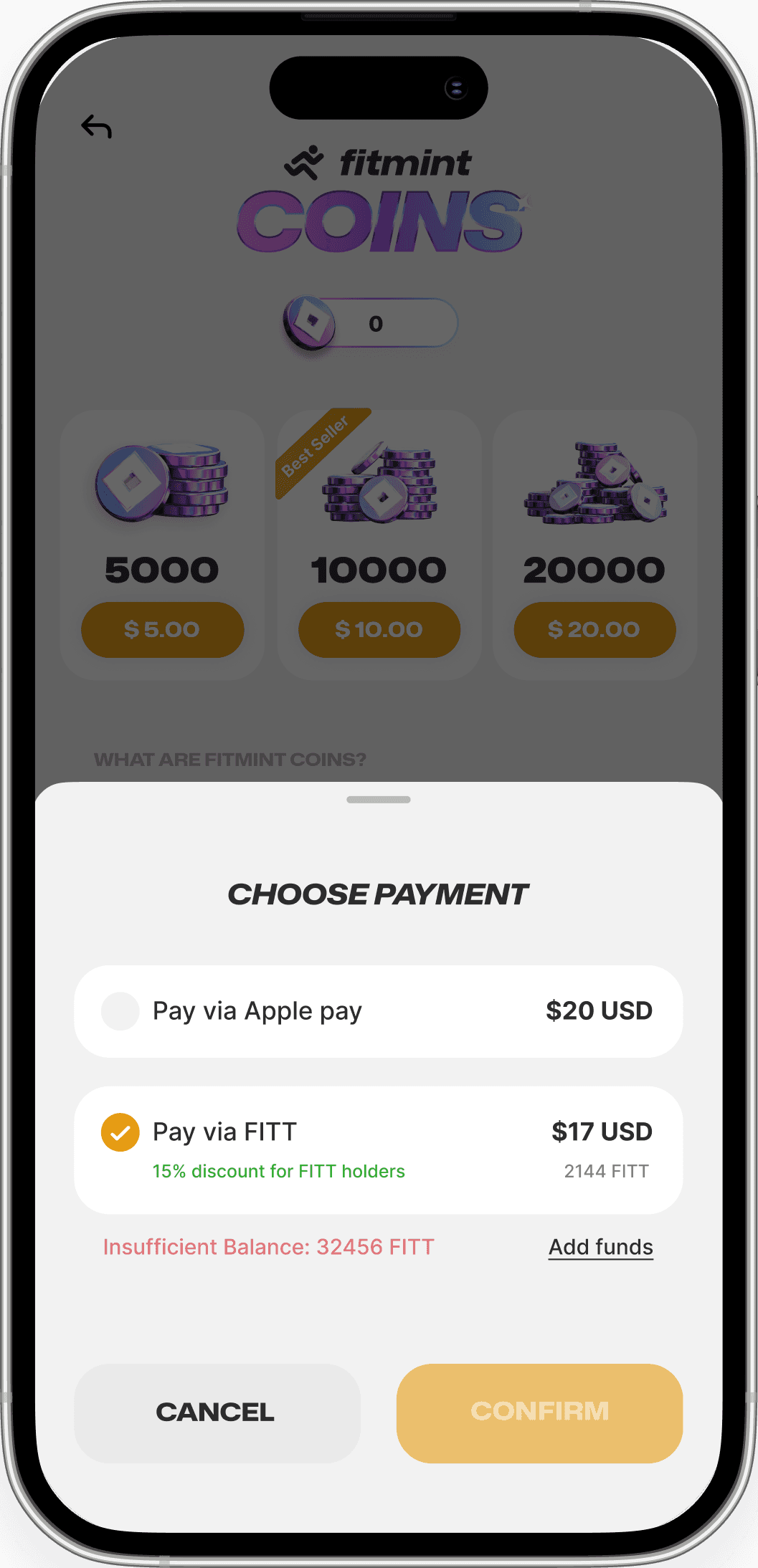 Introduced a bottom sheet for selecting payment methods, with real-time FITT coin conversion to local currency. Also included an "Add Funds" button for quick top-ups during low balances