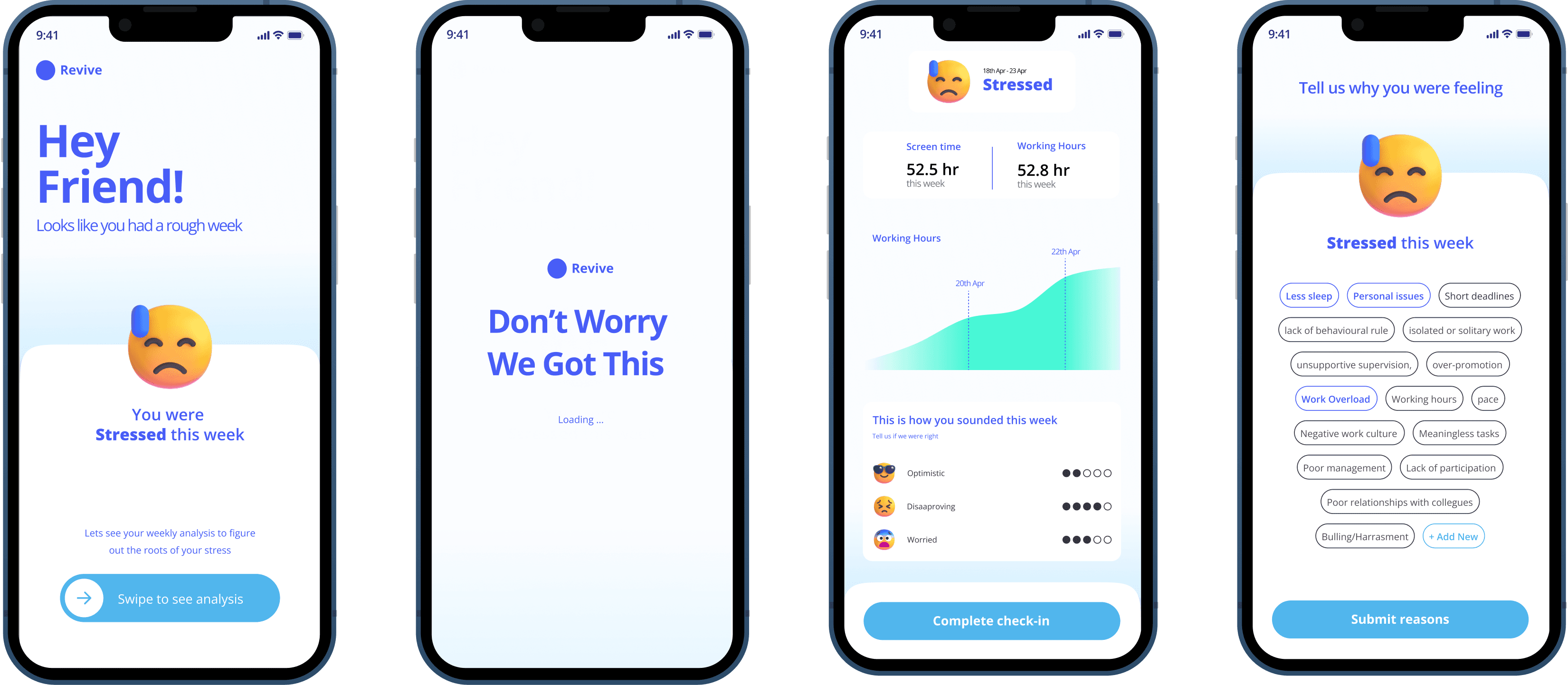 Revive is inspired by Grammarly's tone detection algorithm, just how it detects the tone of your written content. Revive here detect employee's mood by their activities done during the day and the week.