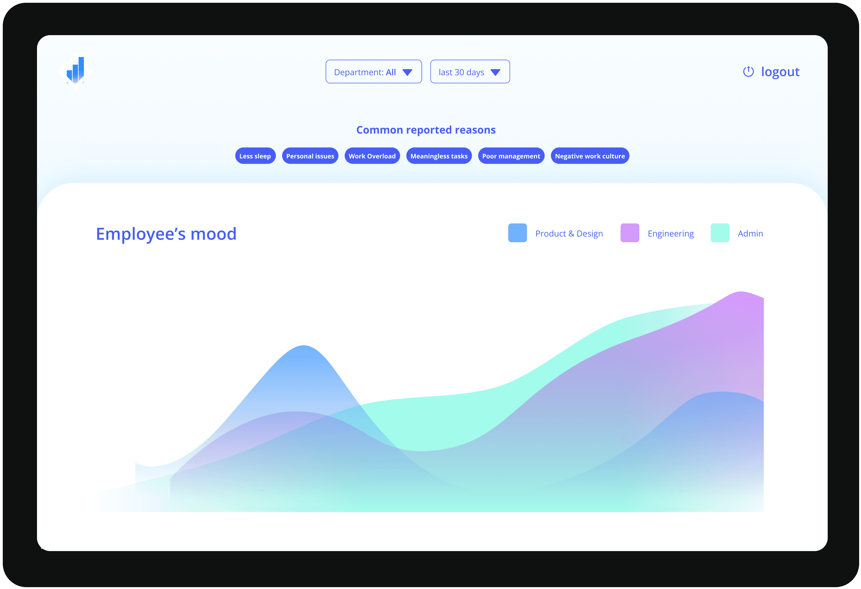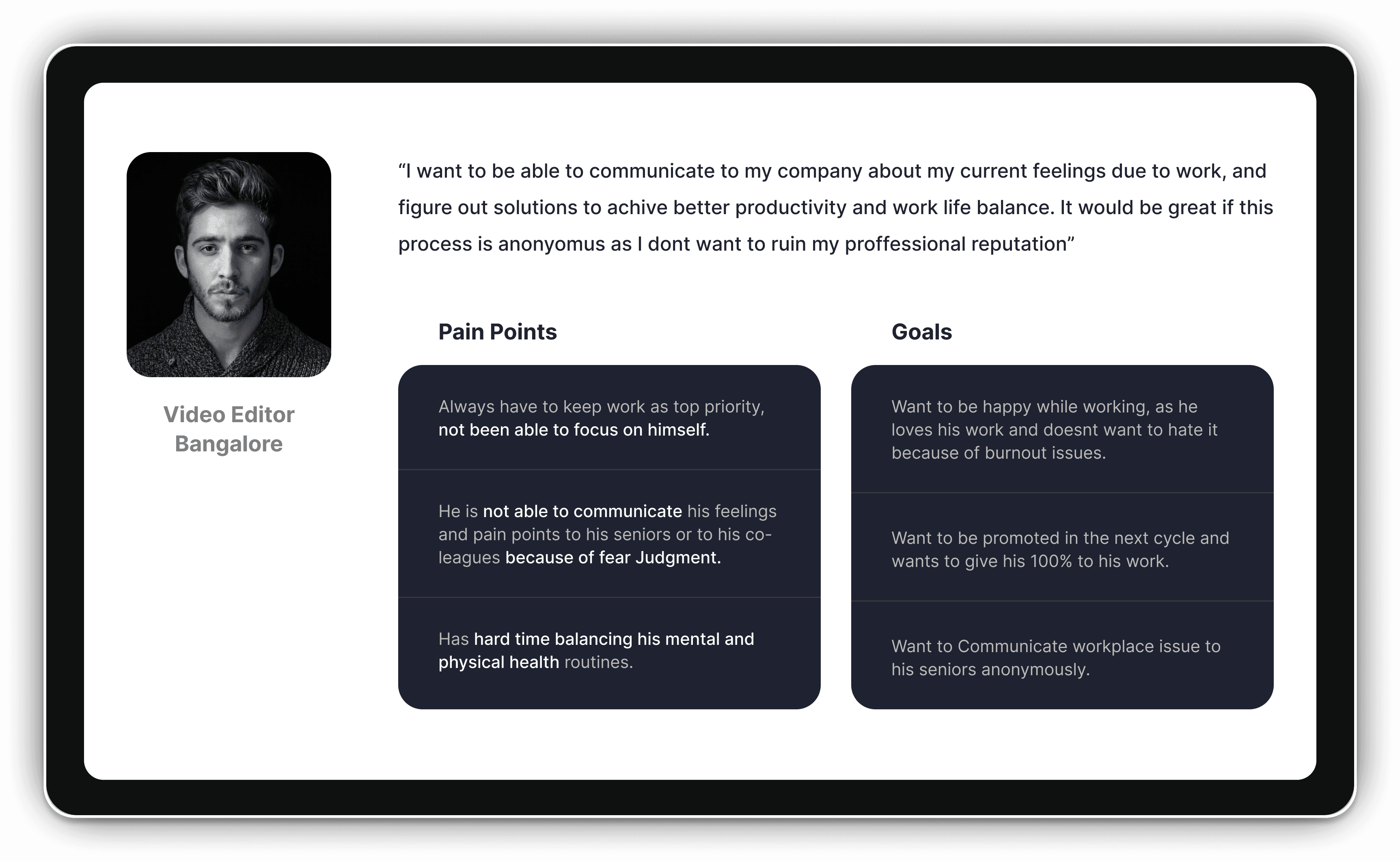 The app was designed employee-first. The mood and state of the employees directly affects their work. After having the interview calls, a persona was created to keep the user’s need and wants in mind