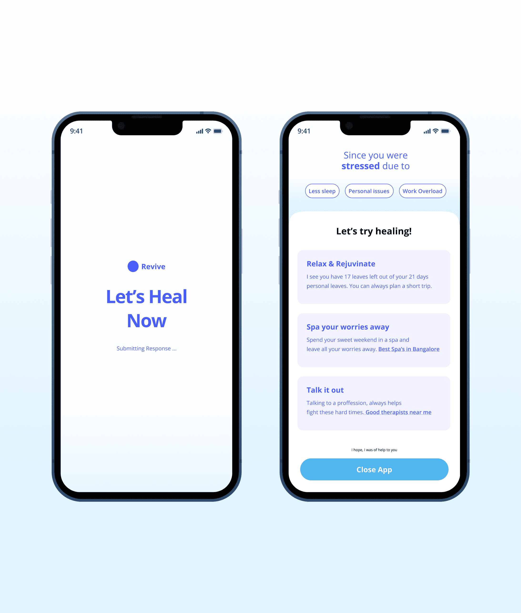 Revive recommends personalised solutions for their feelings, as revive have access to their data, it recommends solution based on their likings and accessibility