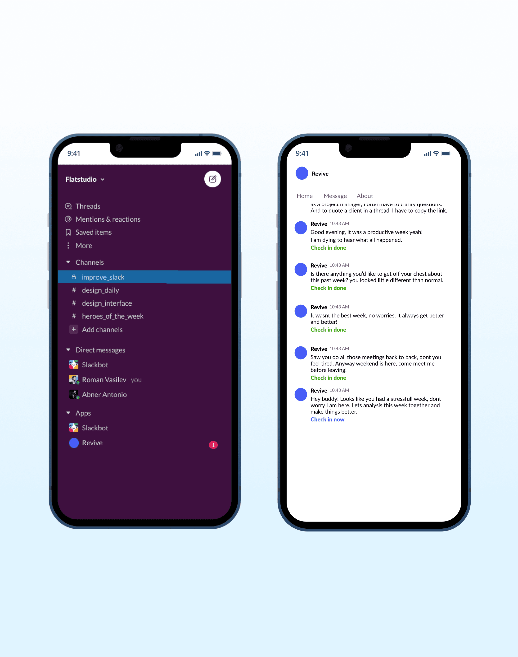 As per the research, major persona had slack as their daily communication channel, so integrating Revive on slack as a bot would result in a seemless experience